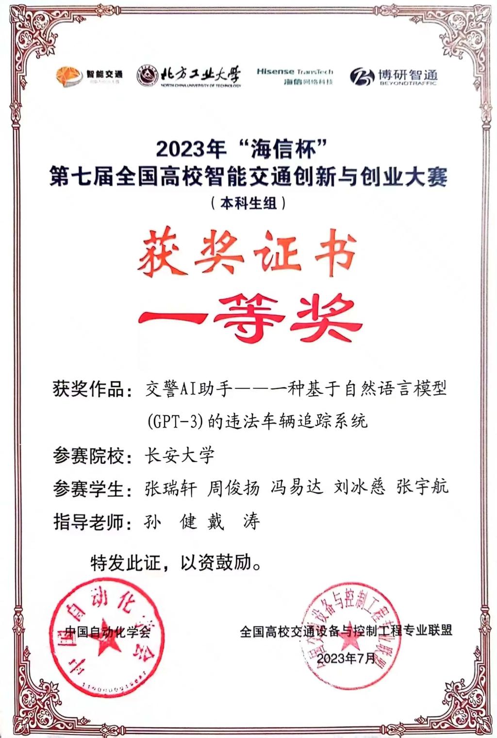 2021级本科生“未来交警AI队”(组长:张瑞轩,成员:周俊扬、冯易达、刘冰慈、张宇航)作品《交警AI助手——一种基于自然语言模型(GPT-3)的违法车辆追踪系统》,在全国总决赛中荣获一等奖。