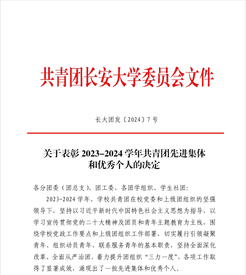 近日,根据《关于评选表彰长安大学2023-2024学年共青团先进集体、优秀个人的通知》文件精神和工作要求,经过材料申报、考核评定等环节,外围买球