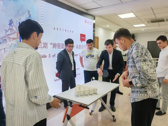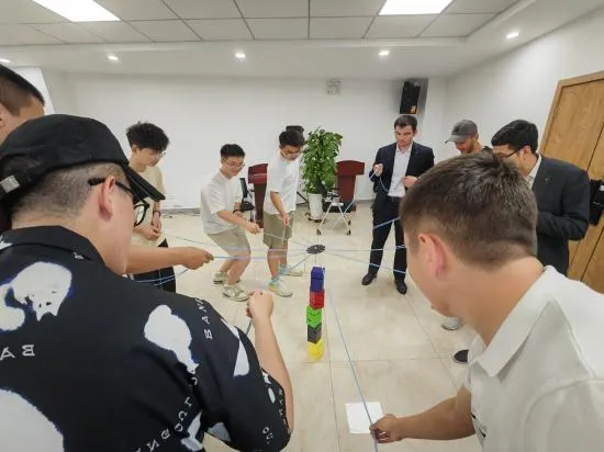在大家熟悉一些常用表达后,紧张而有趣的小游戏环节拉开帷幕。首先进行“乒乓入杯挑战赛”,参赛成员须精准地将乒乓球投入杯中,现场的气氛异常热烈,欢笑声、加油声此起彼伏。此外,现场还组织了团队活动--“堆堡垒”,十名学生一队,大家齐心协力、共同协作,运用刚刚学会的常用语进行交流,以最快的速度堆建起“坚固的堡垒”。趣味小游戏不仅锻炼了大家的团队合作精神和良好的沟通能力,更在无形中增进了彼此之间的友谊与默契。