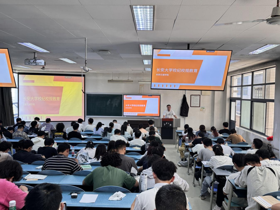 刘志兴主要围绕学风建设、宿舍管理、日常制度等方面展开。他以《长安大学学生手册》为讲解内容,针对学风建设,他结合学生违规违纪案例,详细解读了《长安大学本科生学业预警与帮扶办法》《长安大学考试违规学生成绩认定及学籍处理管理办法》《长安大学学生违纪处分规定》等文件制度,强调了考试违纪和考试作弊的严重后果,呼吁同学们诚信应考,树立良好的学术风气。针对宿舍管理,他着重提醒同学们严格遵守宿舍管理制度,熟悉学生住宿须知,不在寝室存放违禁物品,共同营造良好和谐的宿舍氛围。针对日常管理制度,他解读了《长安大学学生管理一般规定》《长安大学本科生学籍管理规定》等文件,帮助同学们明确日常管理要求、毕业条件标准,鼓励大家德智体美劳全面发展。