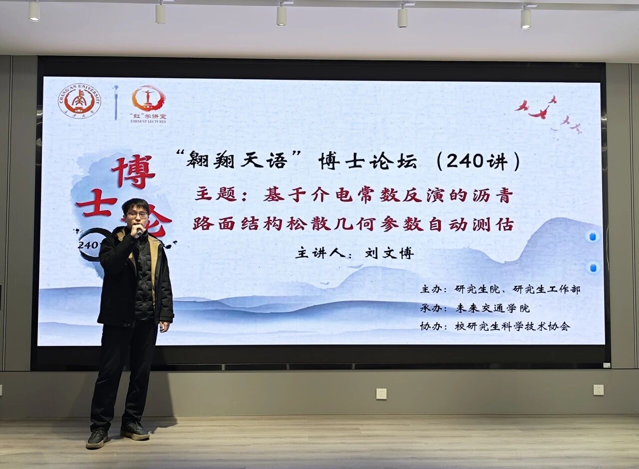 承办,校研究生科学技术协会协办的“翱翔天语”博士论坛第240讲暨“研途领航”系列论坛(第8讲)在北校区弘毅大厦11层未来大师堂顺利举办。公路学院博士研究生刘文博受邀并作了题为“基于介电常数反演的沥青路面结构松散几何参数自动测估”的报告,学院50余名研究生参与论坛。