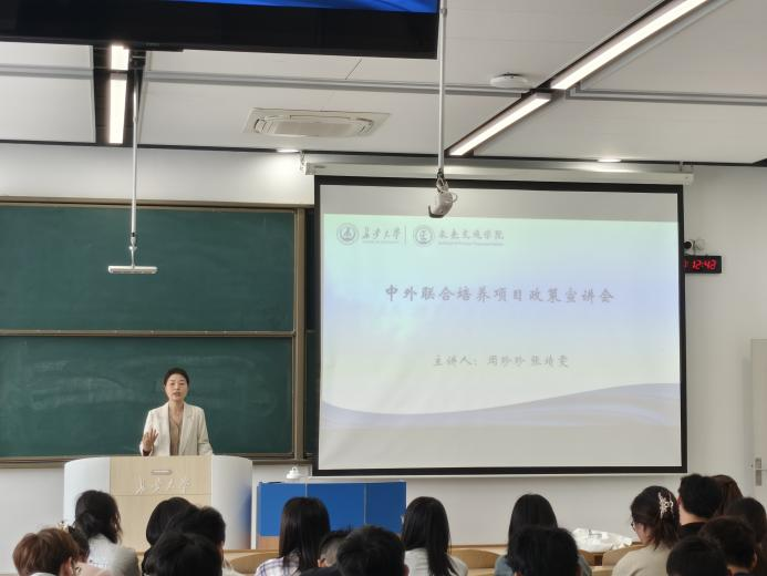 于4月26日上午10时在渭水校区WH1101教室成功举办中外联合培养项目宣讲会。活动特邀国际合作交流处副处长周珍珍、合作办学项目管理科副科长张靖雯担任主讲嘉宾,指导学生国际化培养工作。学院副院长崔华教授主持活动,2024级研究生、2025级研究生(大四推免生)、2023级和2024级华为班学生现场参会。